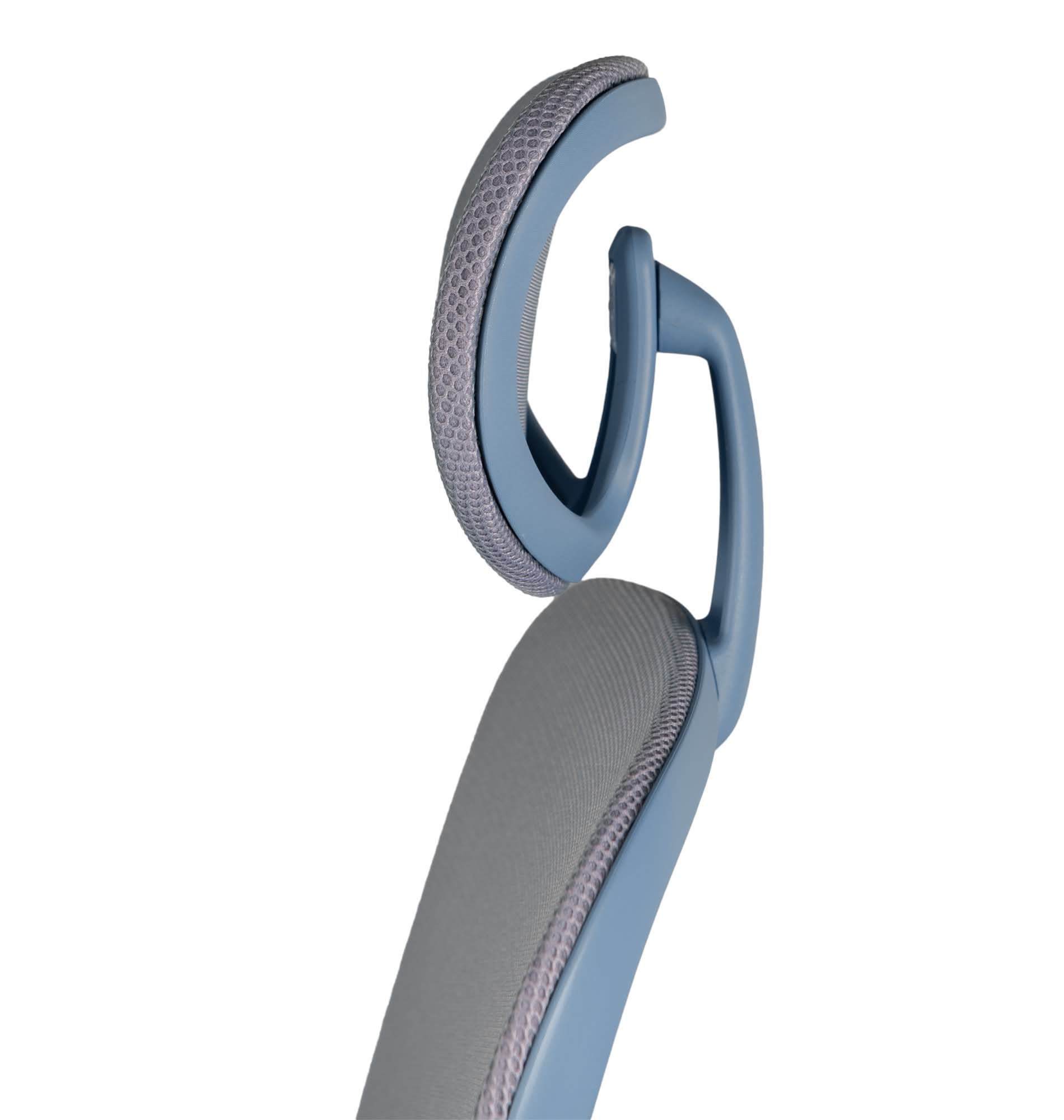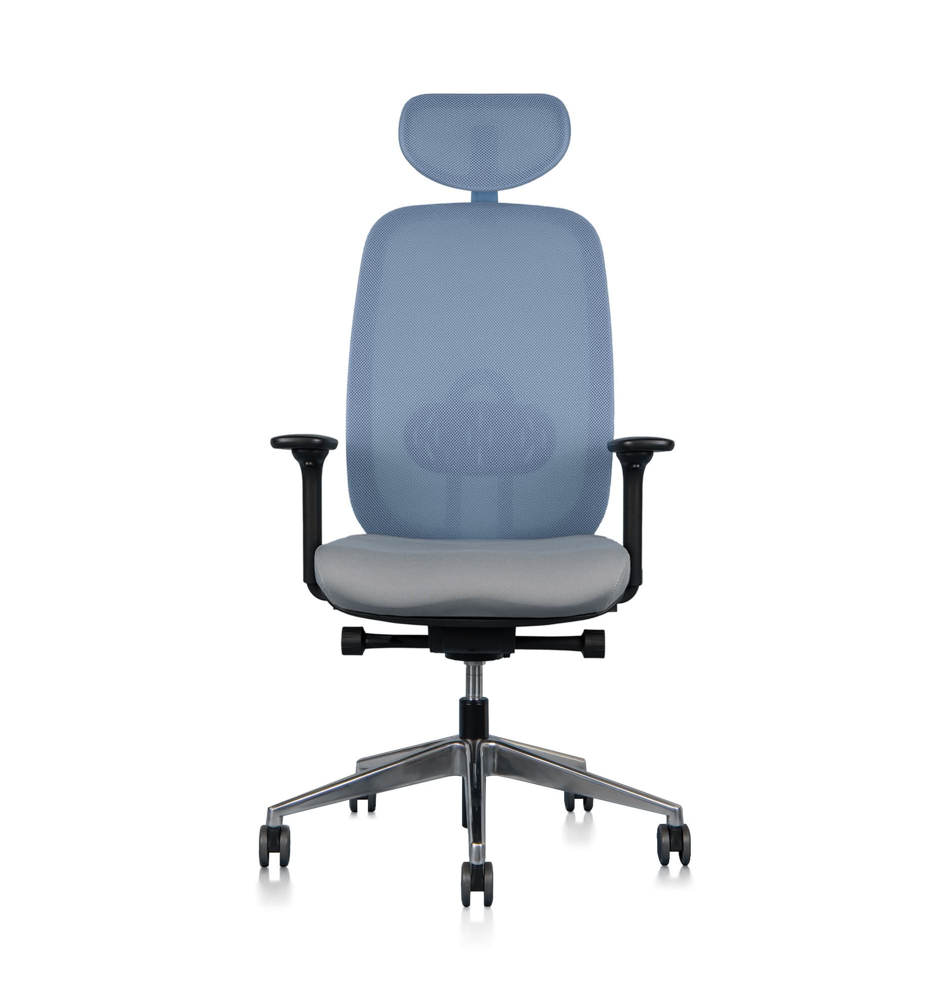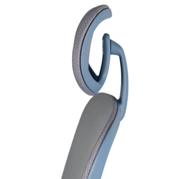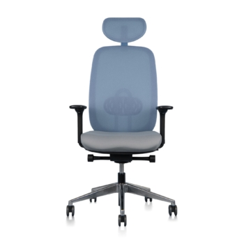 Die Rückenlehne ist aus atmungsaktivem Netz mit integrierter Lendenwirbelstütze gefertigt, die eine optimale Unterstützung der Wirbelsäule ermöglicht. Die Kopfstütze ist vertikal drehbar und höhenverstellbar, wodurch sie zusätzliche Unterstützung für den Nackenbereich bietet.